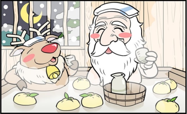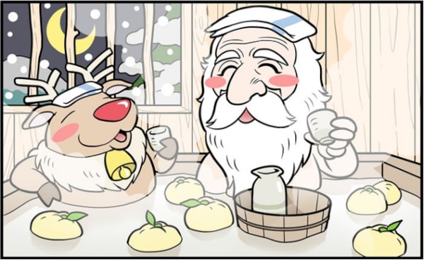 ※まちがいさがしの答え:1)中央の柚子、 2)タオルの向き、 3)木の上に積もった雪