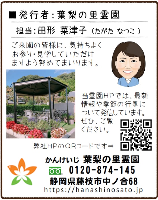 今月号も、最後までご覧いただきまして、誠にありがとうございました。(葉梨の里霊園 田形 菜津子)