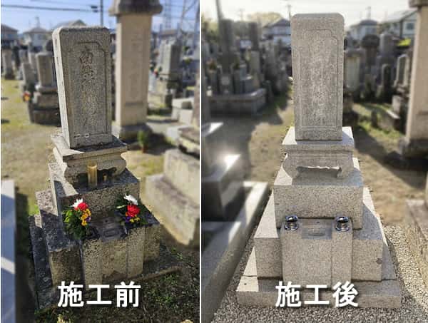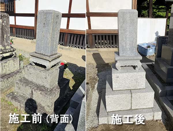 先日、お世話になっているお寺様の境内墓地にお墓をお持ちの方から、「お墓が傾いているので据え直しをしたい」というご相談をいただきました。90年以上経過しているお墓で、現地で打ち合わせの際に、併せてメンテナンスもご依頼いただきました。傾き直しの工事は、先ず石塔を解体、基礎コンクリートのベースを施工して地盤を整えた上で、墓石を据え直しました。墓石はクリーニングして、花立の改良(穴のあけ 直し、水抜きステンレス花筒の設置)を行いました。完成した様子をご覧になって、お施主様には大変喜んでいただきました。