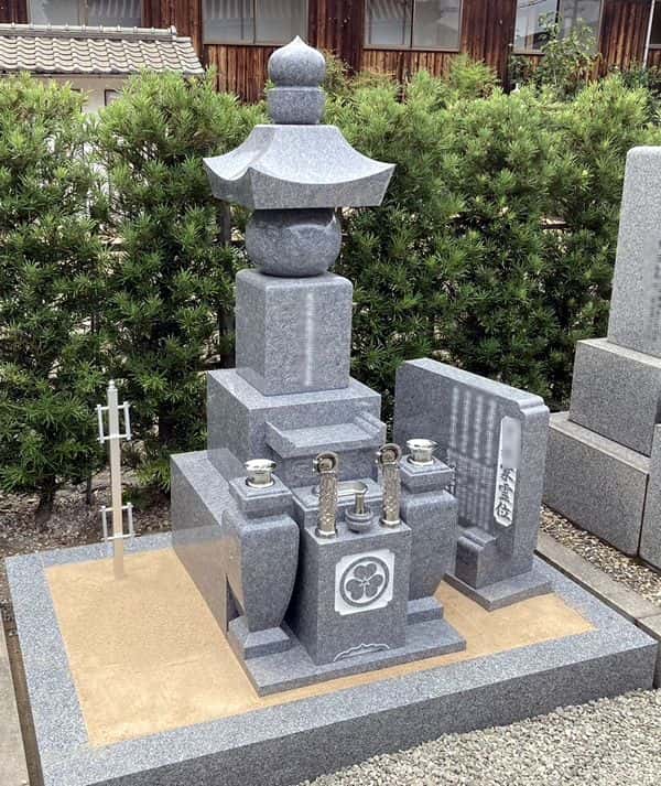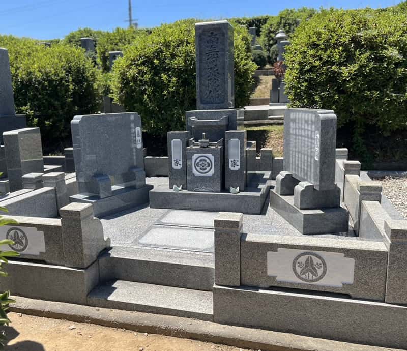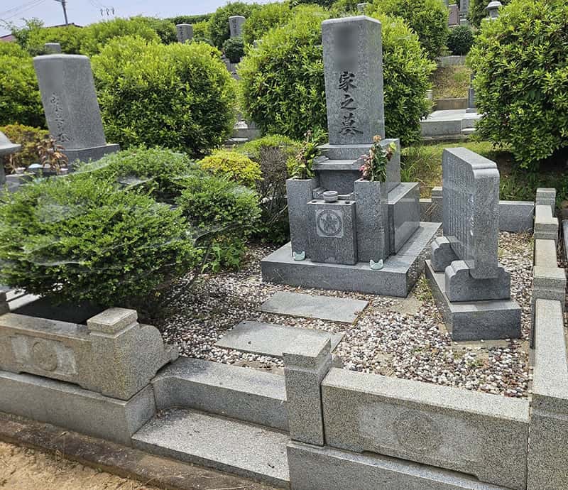 姫路市営名古山霊苑にてお墓の改修工事を行いました。ご依頼者(奥様)のご実家のお墓が元々こちらにあり、嫁ぎ先との両家墓に改修したいというご依頼でした。ご実家の家名が彫刻された竿石を額入れ加工で文字を削り、「南無阿弥陀佛」と彫り直しました。また、法名碑を追加設置し、花立には両家の家名を彫刻しました。墓地内の植栽は剪定が大変なうえ雑草も生えやすかったので、全面貼石施工で仕上げました。完成したお墓をご覧になって、綺麗に出来上がったと大変喜んでいただきました。子孫が絶えることなくお参りできるようにとお考えになり、これからも末永く両家の拠り所となるお墓となりました。