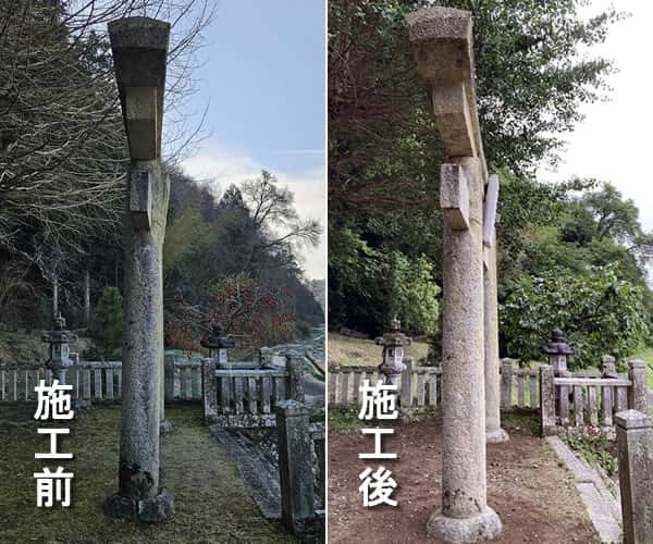 相生市にある神社の管理をしている自治会長様より、「鳥居が傾いているので直してほしい」というご依頼を頂きました。近くで神社の工事をしている石材店がないかとインターネットで調べて、弊社にご連絡をくださいました。およそ100年前の鳥居は前に少し傾いておりました。鳥居を解体してみると、鳥居の柱は土の中に埋まっていただけでしたので、しっかりと基礎工事をいたしました。めったに見ることのない工事なので、工事中は村の方が見に来られていました。十分に基礎が固まったのを確認して、再度鳥居の建立をさせて頂きました。出来上がった鳥居をご覧になって、自治会長様も喜んでくださいました。