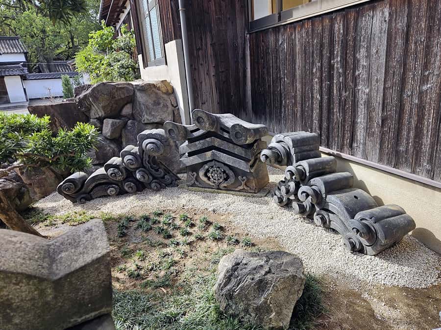 先日、日頃お世話になっているお寺様の境内で、整地工事をさせていただきました。本堂の改修工事の際に、以前使われていた古い瓦を境内に置いてありました。今回は場所を移して、その瓦を屋根のように形づくって据え直しをしました。とても立派な瓦で、すぐに据え直しできるものではなかったので、ご住職と相談しながら高さや角度を決めて、調整しながら設置しました。