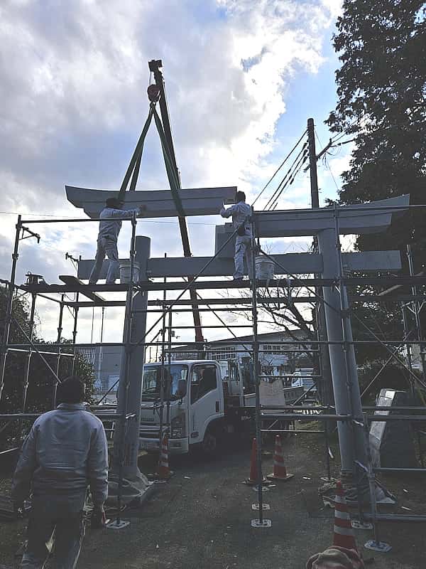 昨年末に、姫路市林田町の建部神社に13尺の鳥居を建立いたしました。以前の鳥居は工事車両が当たって壊れてしまったので、再建することになりました。元々30mほど南に建てられていましたが、ここ10年で2回接触事故で破損してしまったということで、神社と自治会で話し合い、車両の通らない今回の場所に設置しました。基礎工事は今回の工事をお世話してくださった土木業者さんにお願いし、足場を組んで建立しました。弊社はこれまでにも鳥居の工事のご依頼を頂くことが多く、昨年は12尺の鳥居の組み直しと、今回の再建をさせて頂きました。