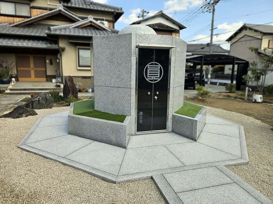 先日、網干区宮内の圓勝寺様に納骨堂「護念堂(ごねんどう)」が完成しました。一つめの納骨堂「共命堂(ぐみょうどう)」を建立させていただいたのが14年前のこと。たいへん人気があり需要が高く、数年前から堂内にご遺骨を置くスペースがほとんど無くなってしまいました。ご住職から2基目の計画のお話をいただき、納骨堂のデザインは前回設計をお願いした方に依頼しました。当時は設計会社にお勤めでしたが、今は独立されて全国的にも有名な納骨堂、永代供養墓の設計士として活躍しておられる方です。今回の設計は住職の意向に沿った形にしていくために、何度も打ち合わせを重ねました。扉の中央には「圓」の一文字をデザインして彫刻しています。完成を待ちわびておられた方も多く、既に幾つかのご遺骨が納められています。