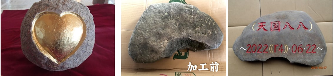 今回は石のオブジェをご紹介します。趣味でモノづくりをされているお客様からのご依頼で、持ち込まれた石に指定のデザインで加工を施したオリジナルの作品です。ハートを彫り込んだオブジェは20cmほどの大きさです。もう一点は幅40~50cmの石を加工したもので、文字と数字を彫刻し、石に磨きをかけて仕上げをしています。