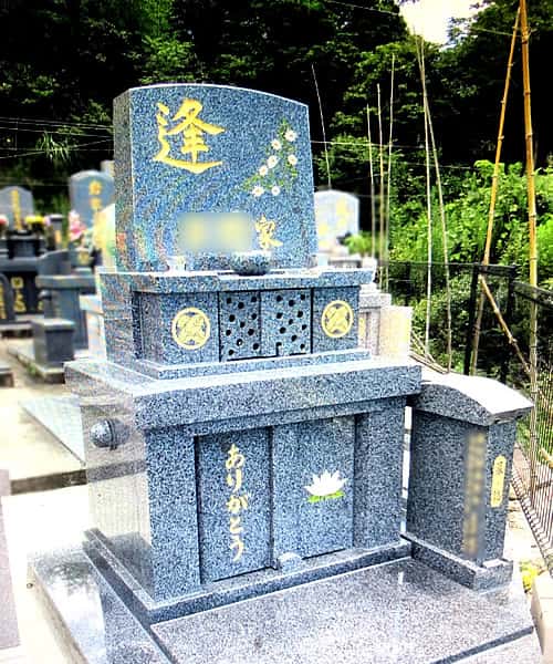 先日、上天草霊園に洋型墓石が完成しました。竿石の「逢」の一文字と「〇〇家」の家名、納骨室扉の「ありがとう」は、お施主様とご家族が毛筆で書かれた文字を彫刻させていただきました。何日も練習を重ねて書かれた文字で、お施主様は「練習した甲斐がありました!」とたいへん喜んでくださいました。このようにお好きな文字や絵柄を自由に彫刻することができますよ。