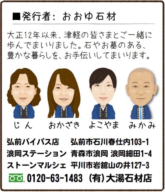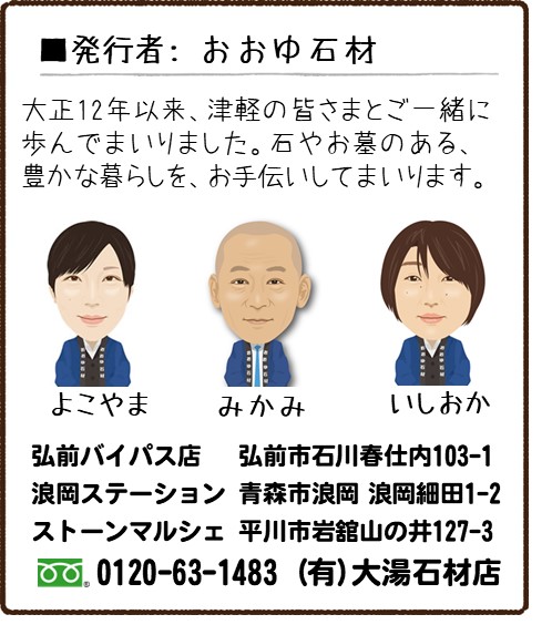 今月号も、最後までご覧をいただきまして、誠にありがとうございました。(おおゆ石材 みかみ)