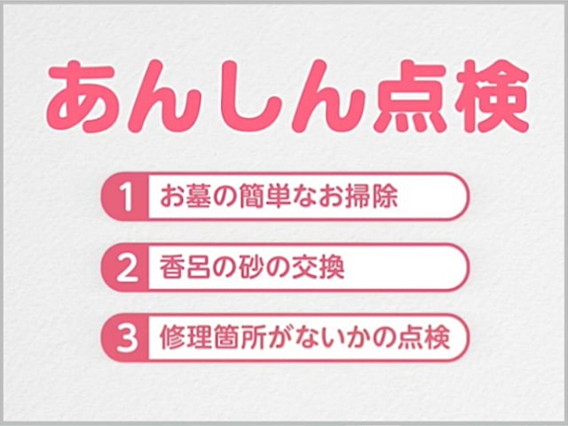 いつもご愛読いただき、ありがとうございます。おおゆ石材の三上です。緑濃くなる時期となりました。おおゆ石材では5月より毎年恒例のお墓の「あんしん点検」を実施しております。「あんしん点検」とは、当社でお墓を建てていただいたお客様対象の無料のアフターサービスです。お盆を目安に、お墓の簡単な清掃、香炉の砂の交換、修理箇所の有無の点検を行い、点検結果はハガキにてお知らせしております。毎年多くの方から「ありがとうございました」「気持ちよくお参りができました」などの温かいお言葉をいただき、スタッフ一同感謝の思いでいっぱいです。