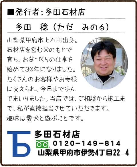 今月号も、最後までご覧いただきまして、誠にありがとうございました。(多田石材店 多田 稔)